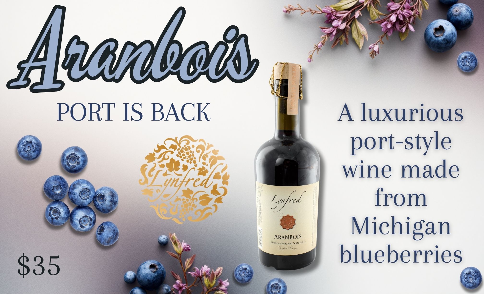 A masterpiece of patience and craft, our Lynfred Aranbois makes its grand debut on November 1. This luxurious port-style wine is crafted from 100% Michigan blueberries, fortified with California grape spirits, and aged 48 months in American oak.