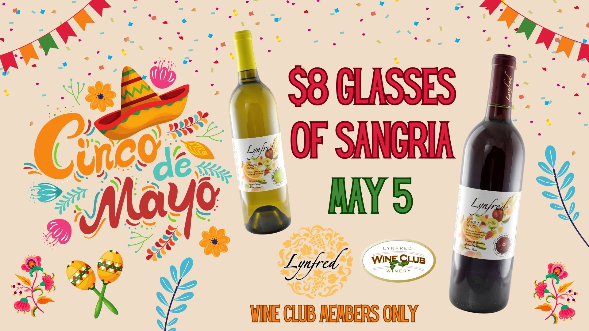 Cinco de Wino Celebrate Cinco de Wino with $8 glasses* of our Sangria Rouge & Sangria Blanc, all day long. PLUS – take the fiesta home with an extra 10% off Sangria Wines all day! *Wine Club Members Only Available in Roselle and Highland Park. + Add to Google Calendar + iCal / Outlook export 00 days 00 hours 00 minutes 00 seconds Date May 05 2026 Time All Day Category Event Share this event CartTypeVin de City Collection Anniversary Collection Gift Cards Events Reserves Gift Baskets Red Wine White Fruit Sparkling Ports Seasonal