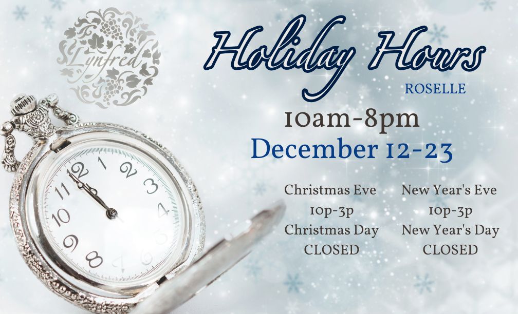 Extended Holiday Hours Our extended holiday hours of 10am-8pm begin December 1 and go through December 23. + Add to Google Calendar + iCal / Outlook export 00 days 00 hours 00 minutes 00 seconds Tags: holiday hours Date Dec 12 2026 Time Last tasting sold at 7:15pm 10:00 am - 8:00 pm Location Lynfred Roselle Category Holiday Share this event CartTypeEvents Vin de City Collection Anniversary Collection Gift Cards Reserves Gift Baskets Red Wine White Fruit Sparkling Ports Seasonal