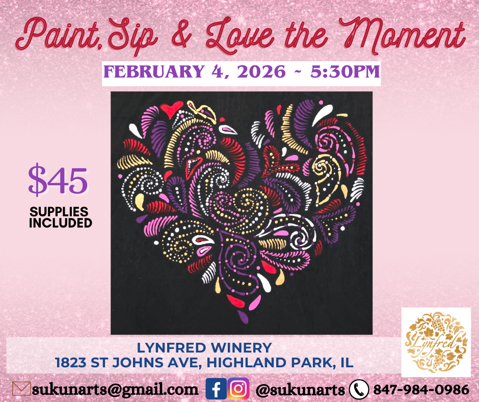 Grab your Valentine, or Galentine, and join us for a Paint & Sip Workshop with Sukun Arts! Using mandala dotting techniques, we’ll create a beautiful heart design while enjoying a calm and joyful atmosphere. With a splash of love-inspired colors and soothing rhythms of dotting, this session is perfect for unwinding, expressing creativity, and truly letting love be in the air.