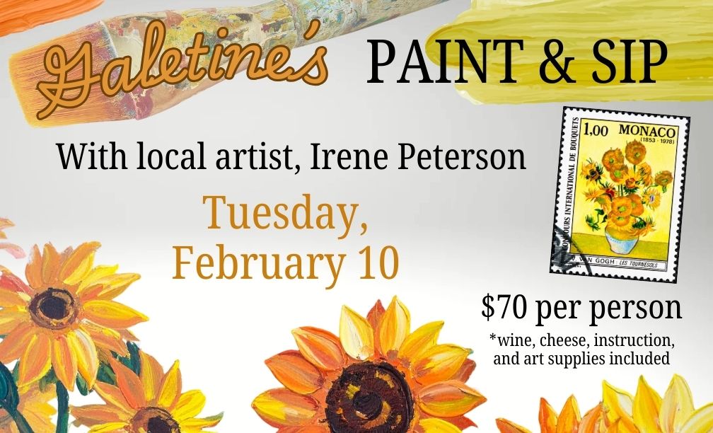 We have been following Irene’s work for many years, and we are honored to have her as our resident painter for this exclusive event. Irene will take 12 guests through a workshop, recreating Van Gogh’s ‘Sunflowers’ painting. All painting supplies are included, including acrylic paint, brushes, an 11×14 canvas, and easels. Wine and cheese will also be provided.